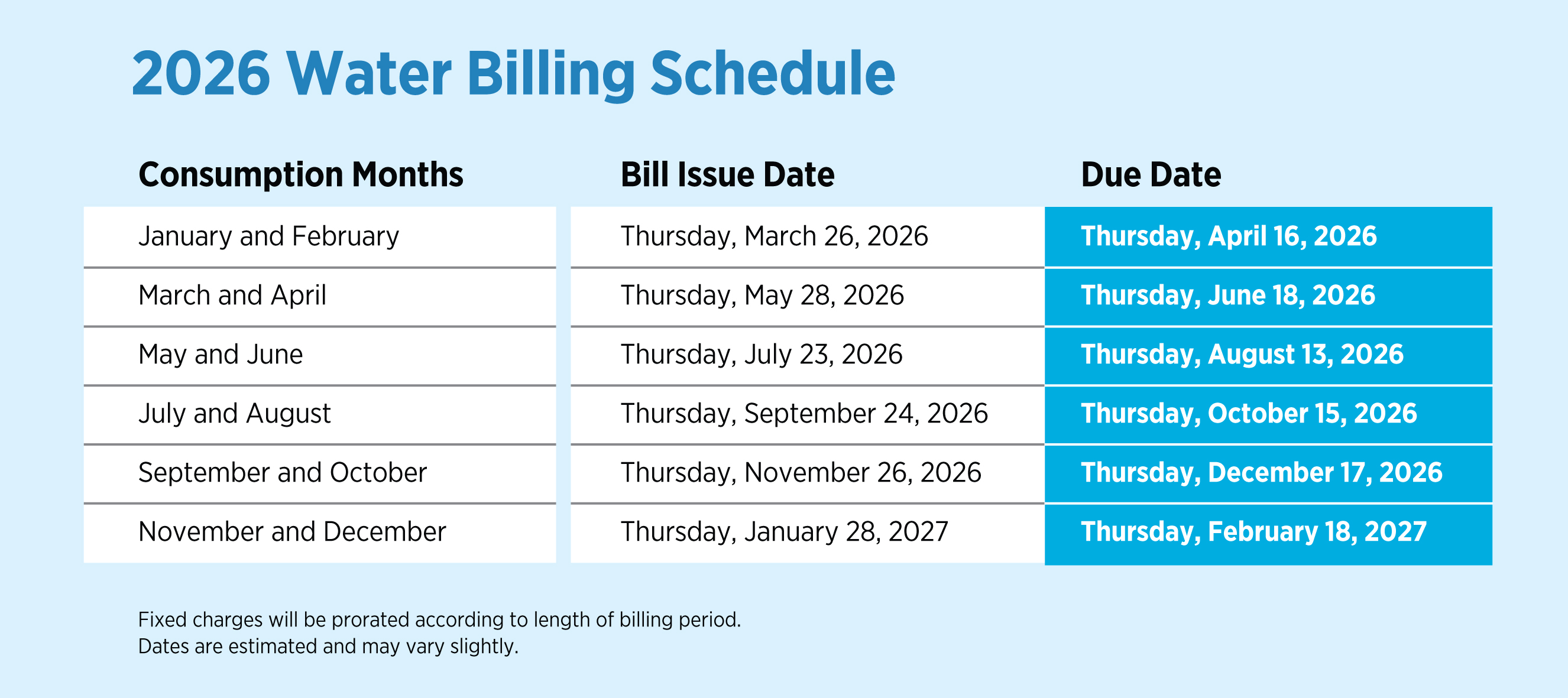 Beginning in March 2026, all customers in Town will be on the same billing schedule and receive a bill every other month. All water customers will be on the same billing schedule going forward.