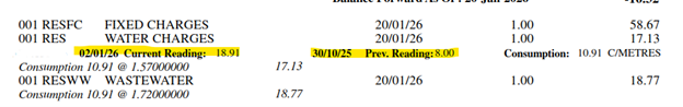 Previously, all billing areas in the Town (A, B, C, and D) were billed three times per year, with each bill covering four months of consumption. A final bill for all areas was issued at the end of January 2026. This bill covered up to the end of December 2025. Fixed charges were prorated based on the number of months billed.